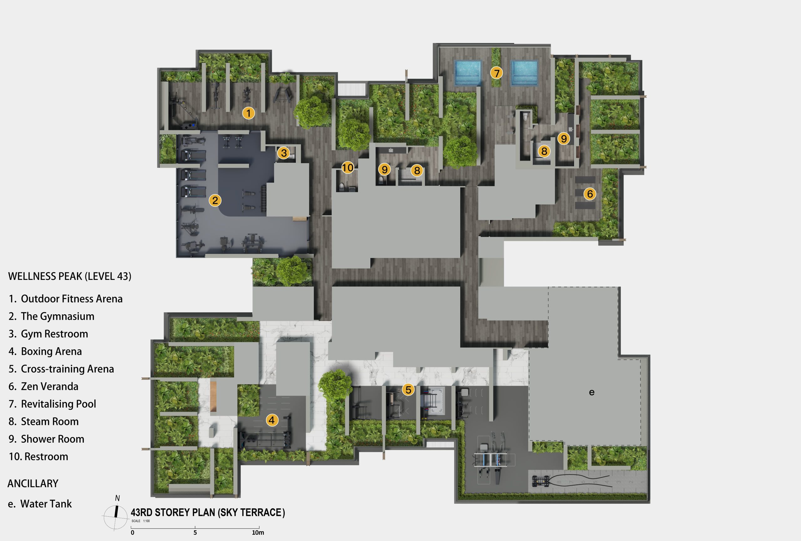 Wellness Peak (Level 43): Gym, boxing arena, outdoor fitness.
